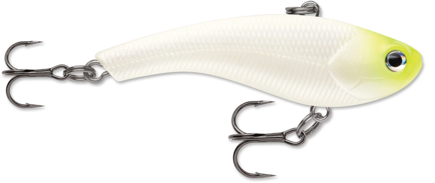 The Rapala Slab Rap SLR06 is a 2 1/2 inch, 3/8 ounce lipless jigging lure. Rapala recommends anglers fish the Slab Rap with quick rod snaps. The Slab Rap searches in wide, erratic directions, circling back to center after pause. Lift-drop motion creates subtle vibration on rise, followed by evasive side-to-side motion on the fall. Weight forward design enables a rocking action for triggering negative fish. Comes pre-rigged with size 8 VMC trebles.